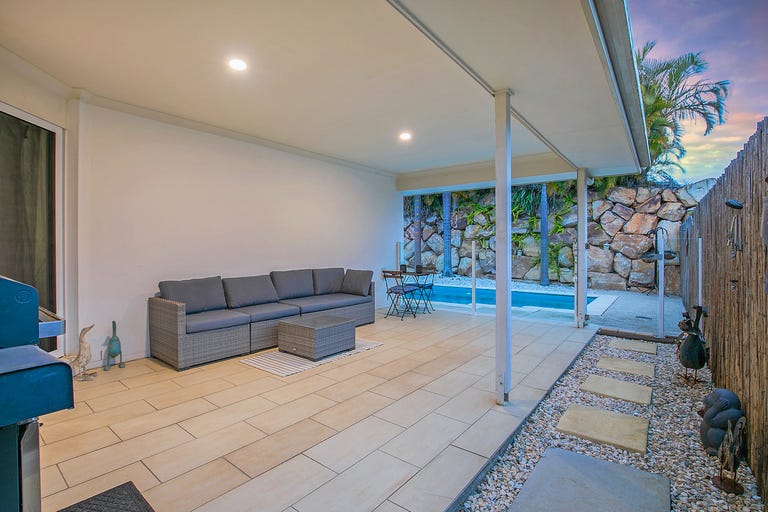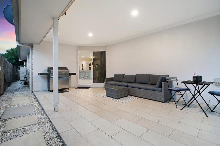 The indoor space flows effortlessly to the outdoor entertaining area through sliding doors off the living room. The covered alfresco has been thoughtfully designed for relaxed gatherings and weekend entertaining. This private space with low maintenance yard, tiled flooring, gorgeous pool with glass fencing, lighting, artificial turf and bamboo fencing is perfect for year-round enjoyment. There is a storage shed and a water tank at the back of the yard.