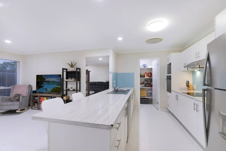 The kitchen is beautifully appointed and thoughtfully positioned to overlook both the living and outdoor areas, making it easy to stay connected whether you're hosting guests or supervising homework at the dining or study table. It features long benches, an electric oven and cooktop, stainless steel double sink, tapware, dishwasher, overhead cupboards, under-bench storage, and a spacious walk-in pantry.