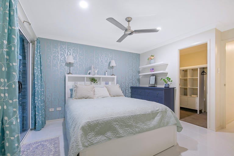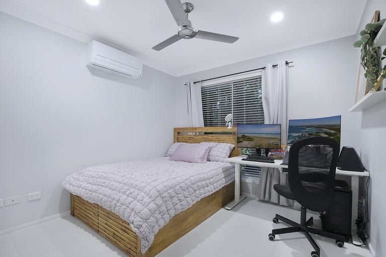 • Bedroom four at the front of the home with built-in robe, split air-conditioning, ceiling fan, venetian blinds, curtains and security screens