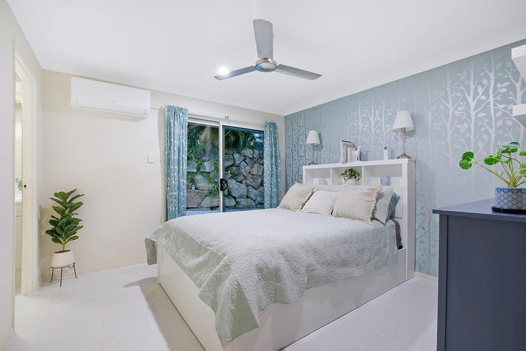 The master bedroom is tucked away at the rear of the home, offering a private and relaxing space. It features a walk-in robe, split air-conditioning, a ceiling fan, curtains and a sliding door with security screen overlooking the pool. The ensuite is equipped with a shower, vanity, toilet, frosted glass, and a security screen.