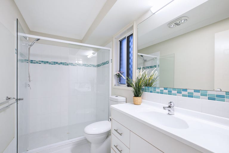 These rooms are serviced by the main bathroom, which includes a vanity, shower, bath, blinds, frosted glass for privacy, security screen, and an adjacent separate toilet.