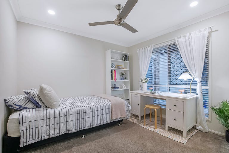 well-proportioned fourth bedroom —ideal as a guest room or a teenager's retreat—complete with a built-in robe, split air-conditioning, ceiling fan, venetian blinds, curtains and security screens.