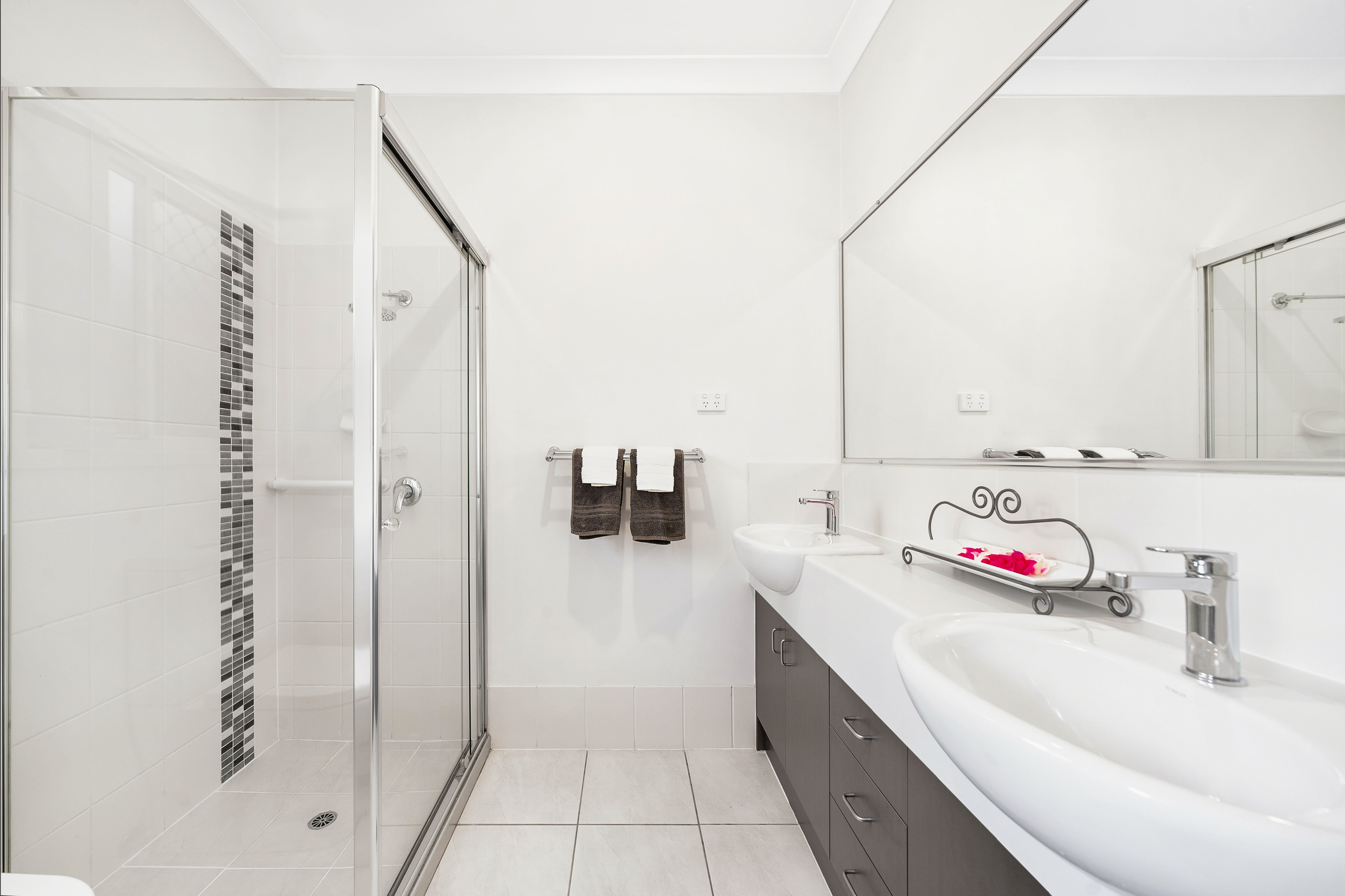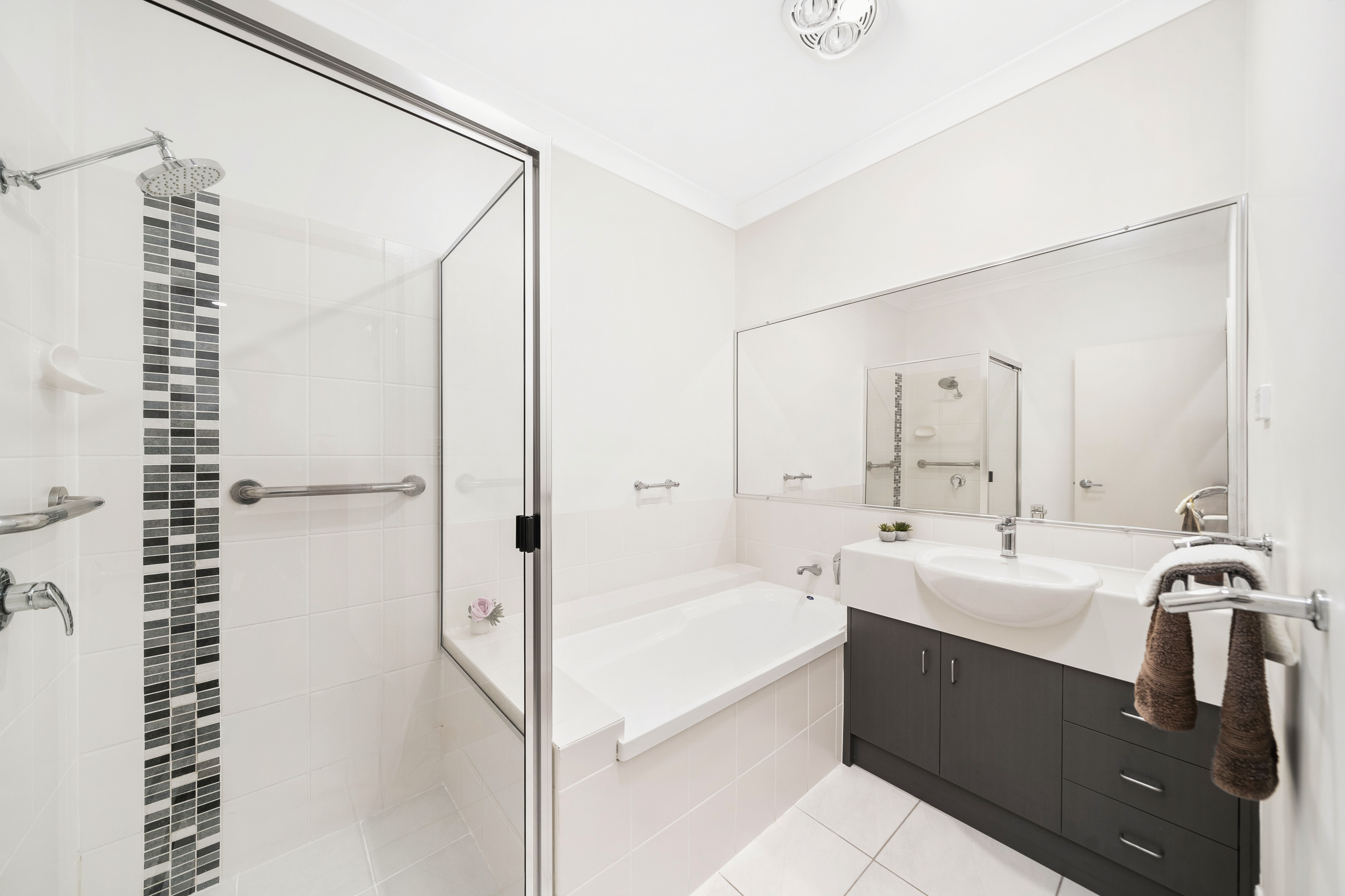 The main bathroom is well-appointed, featuring a separate bath and shower, a 3-in-1 heater, exhaust fan, and LED lighting. Two grab rails in the shower and a large wall-wide mirror add practicality and modern convenience.
