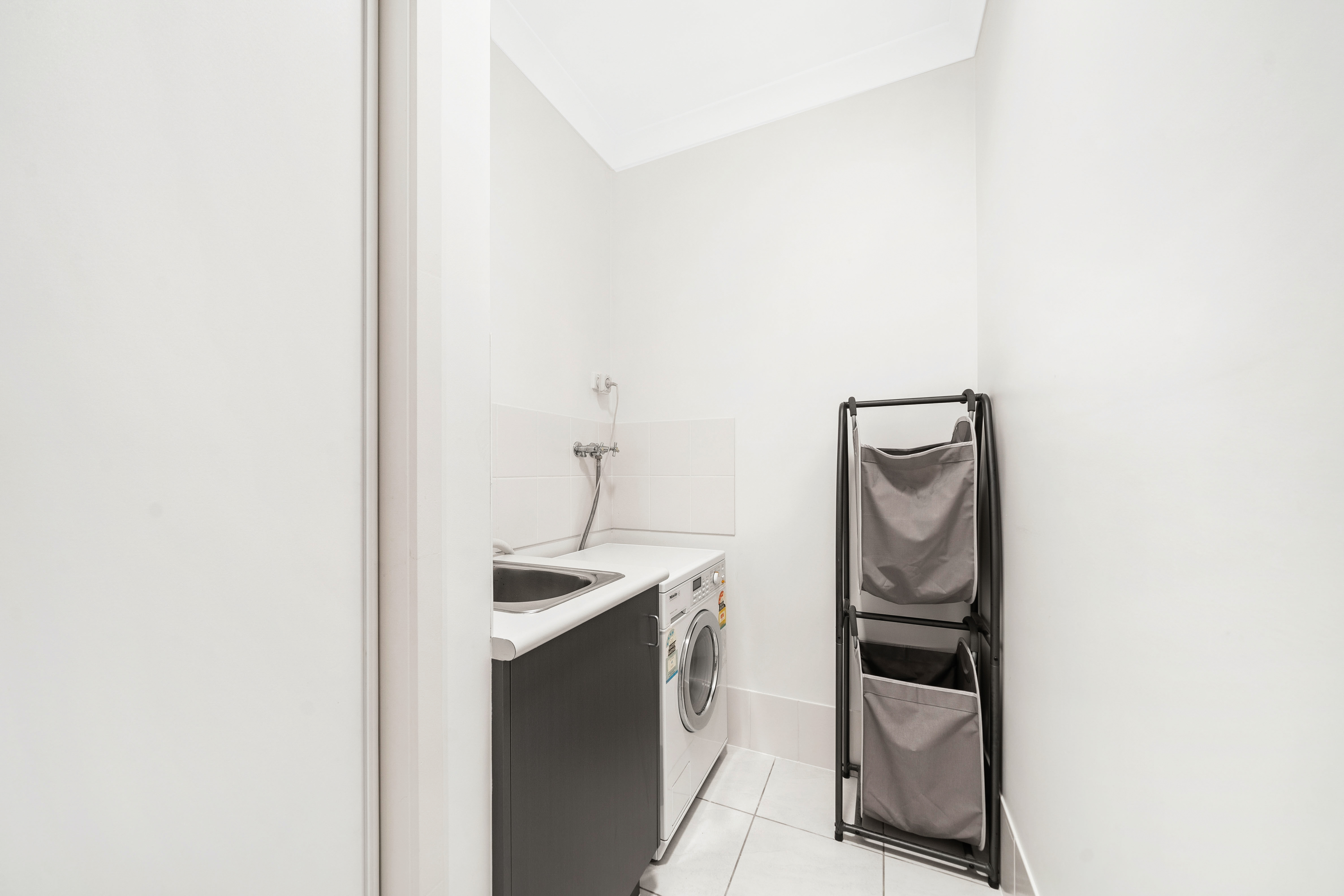 An internal laundry with a sink, under-bench storage, and enough space for either a top-load washing machine or a stackable washer and dryer makes household tasks a breeze. The tiled flooring throughout the home's main areas ensures both style and durability.