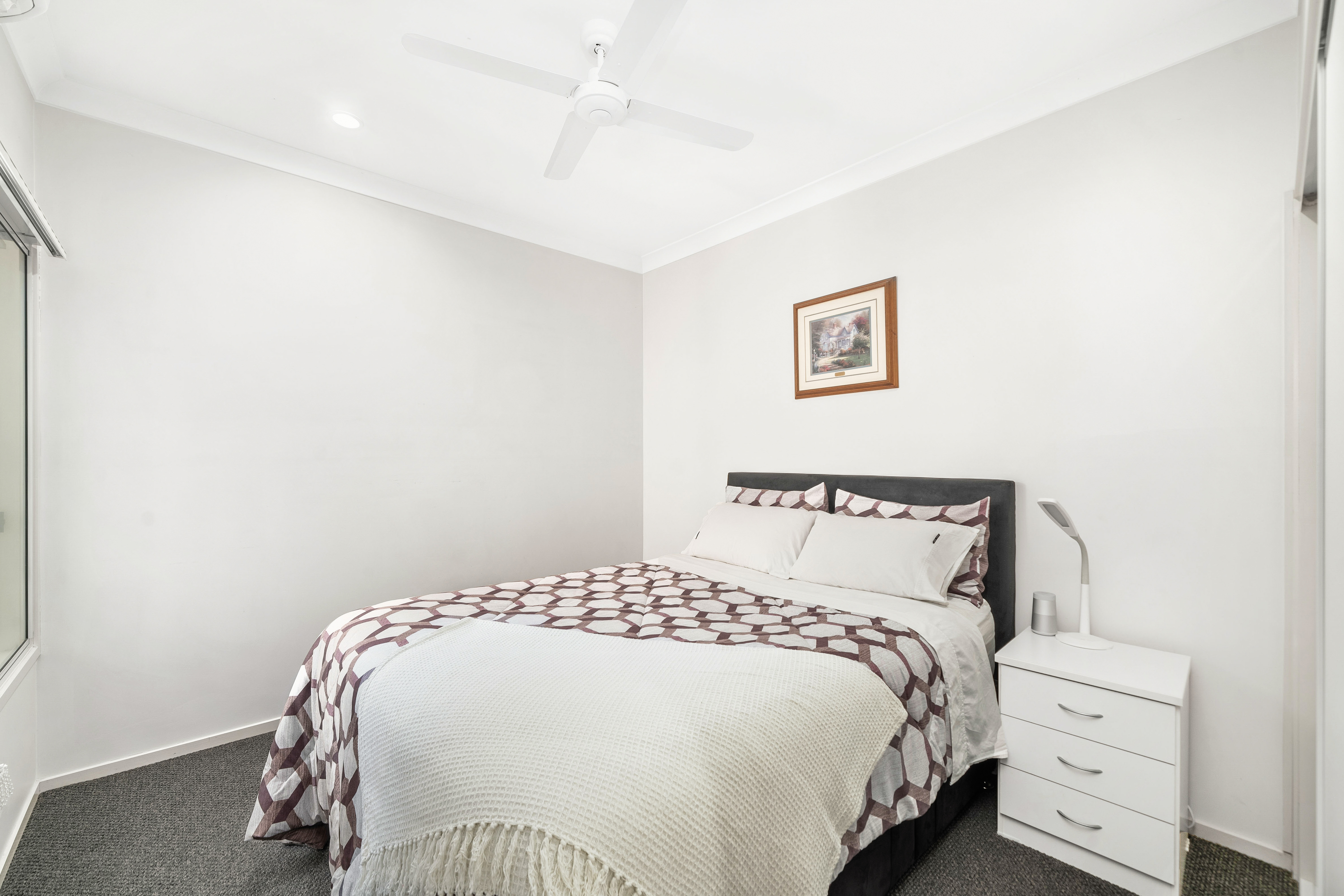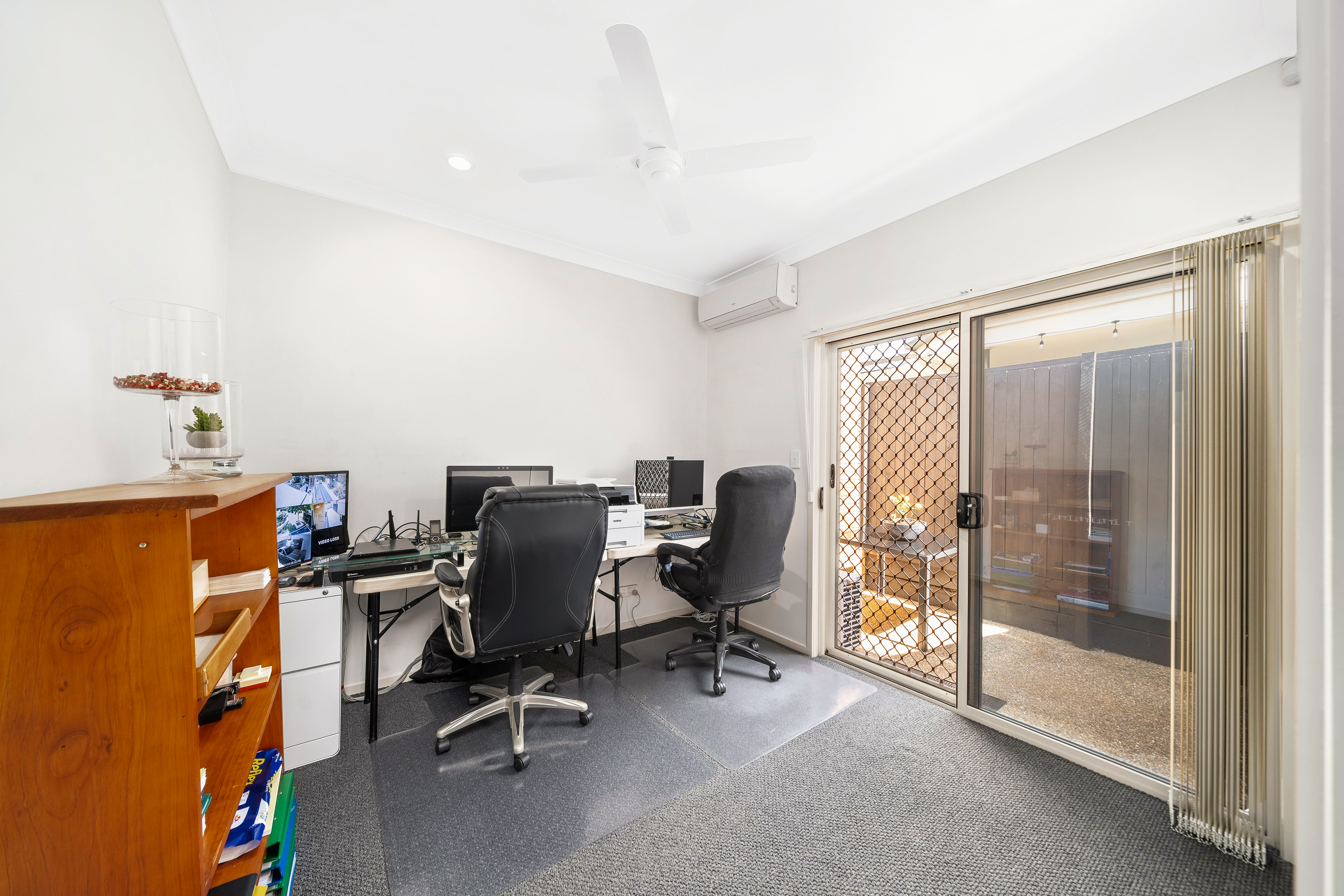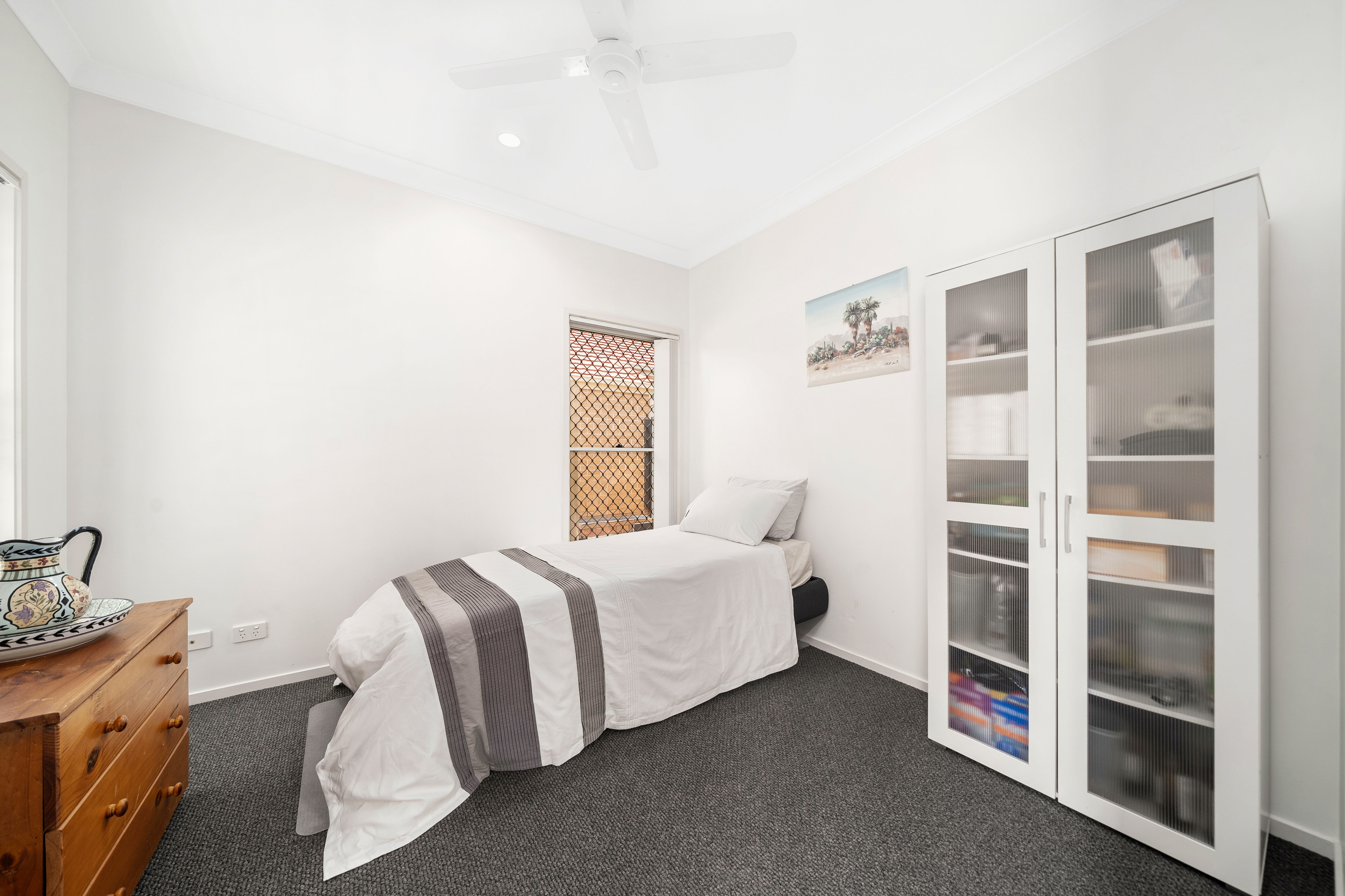 Each of the four carpeted bedrooms is designed with comfort in mind, featuring built-in robes, ceiling fans, and large windows that allow for plenty of natural light. Three of the bedrooms are air-conditioned, ensuring cool and restful nights during the warmer months.