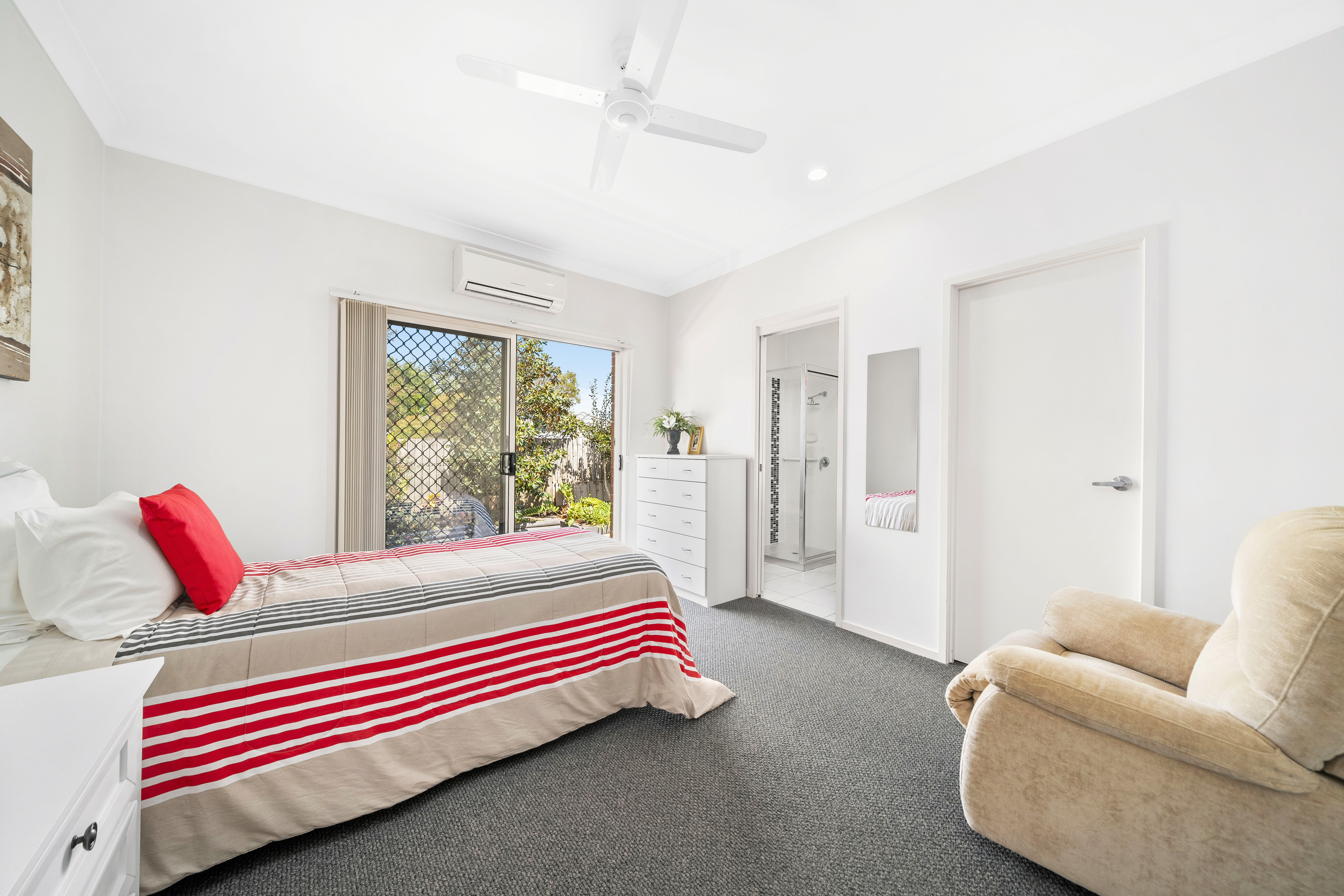 The main bedroom is a standout feature, offering a private retreat with air conditioning, a walk-in wardrobe, and an ensuite with double sinks. Sliding doors open directly to a peaceful courtyard and garden, providing a personal outdoor space to enjoy.