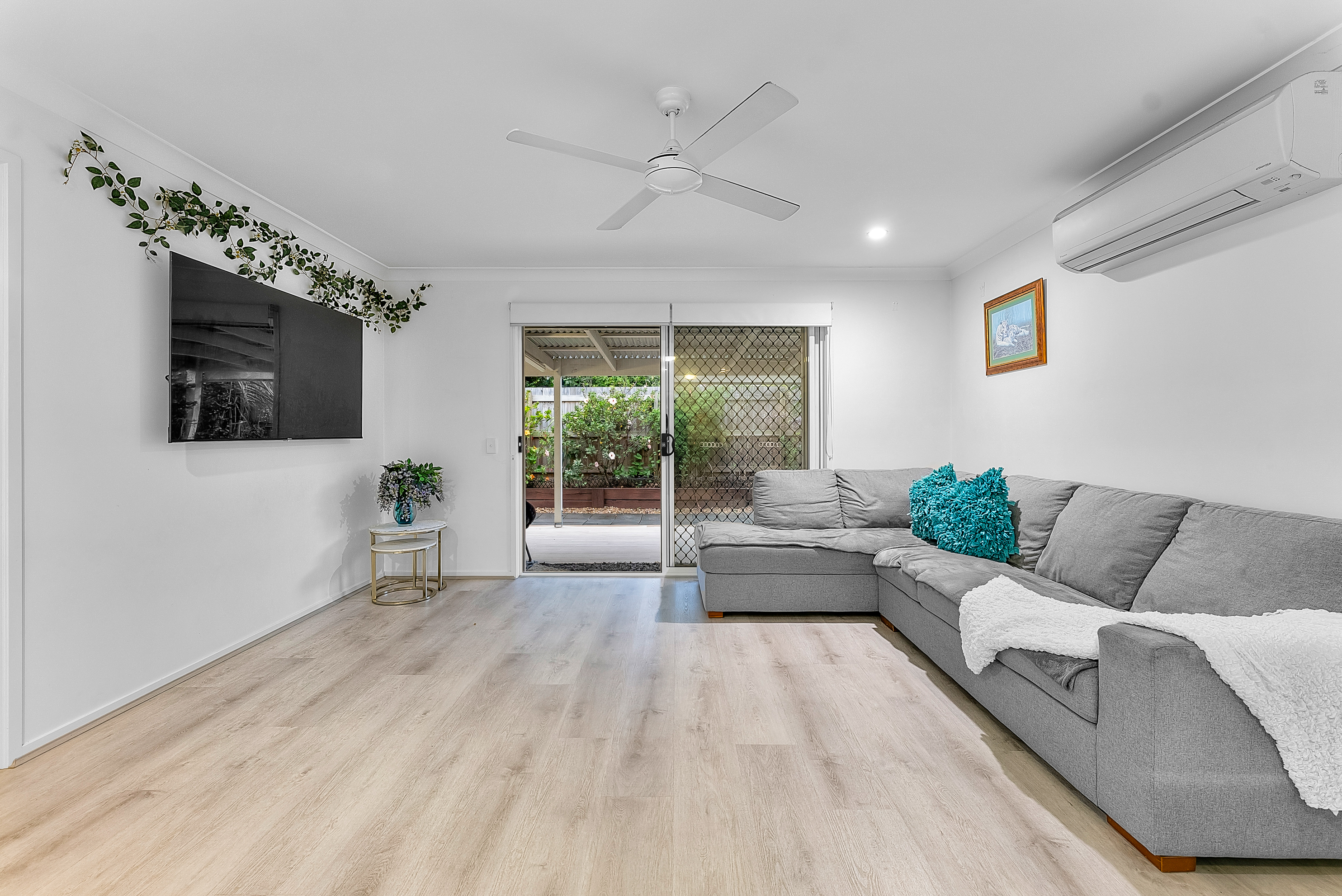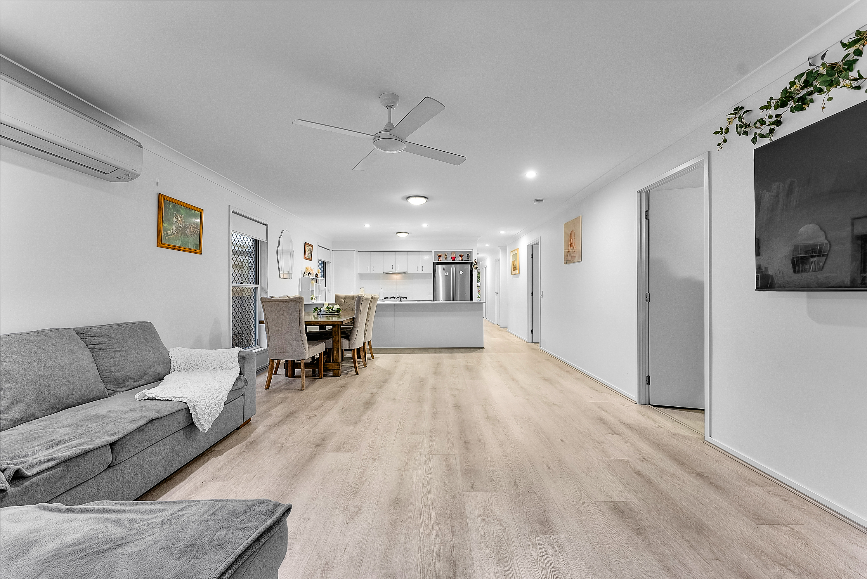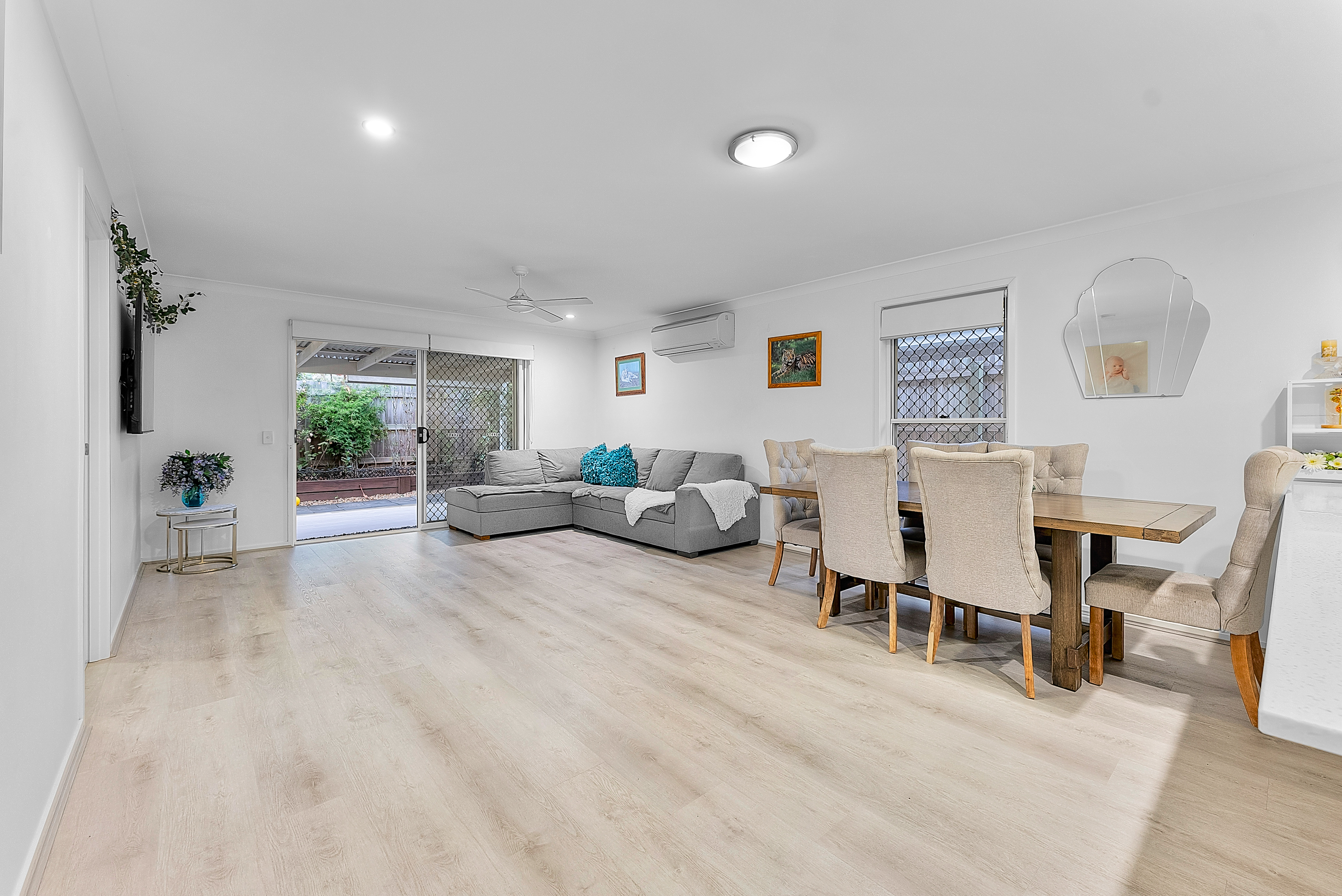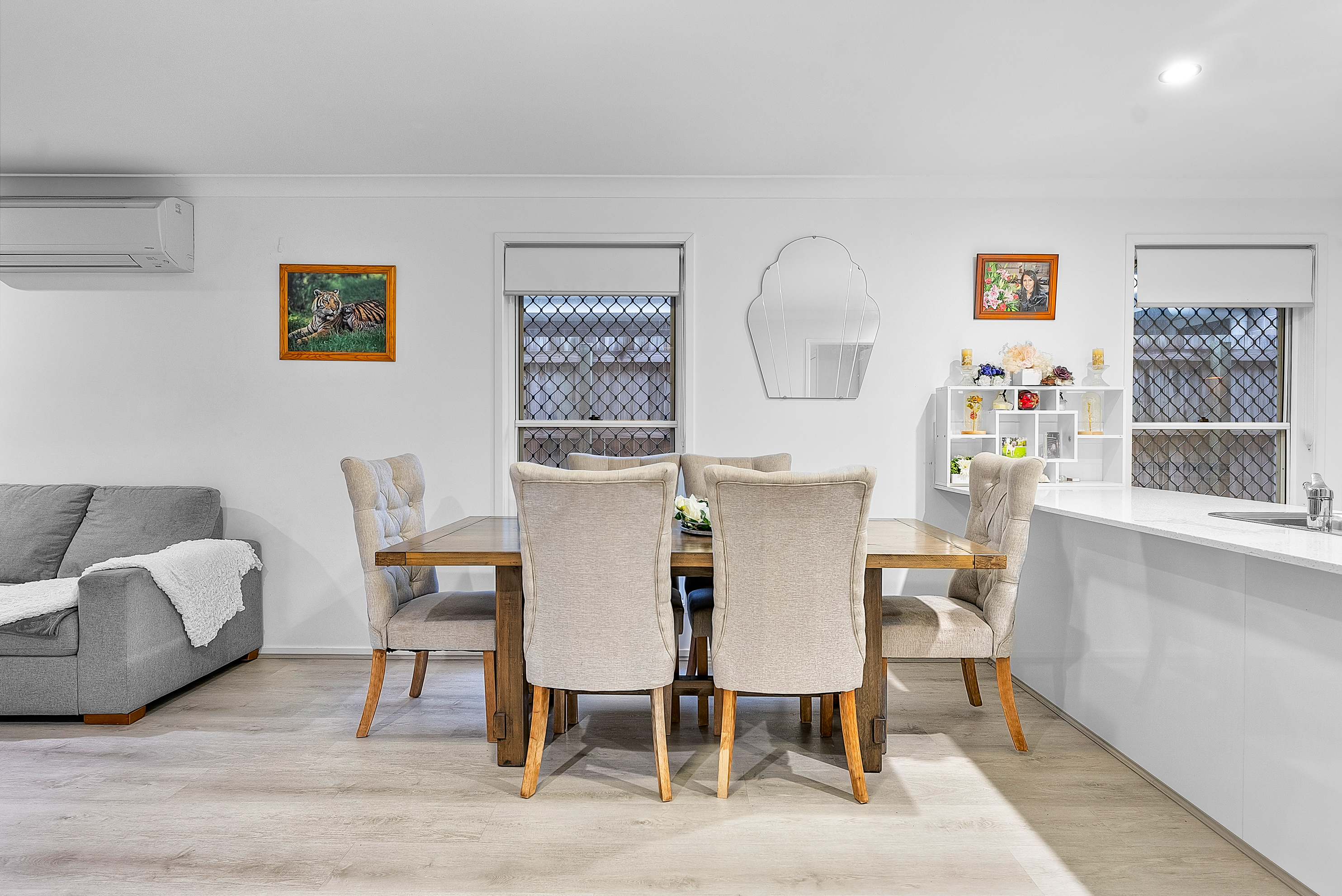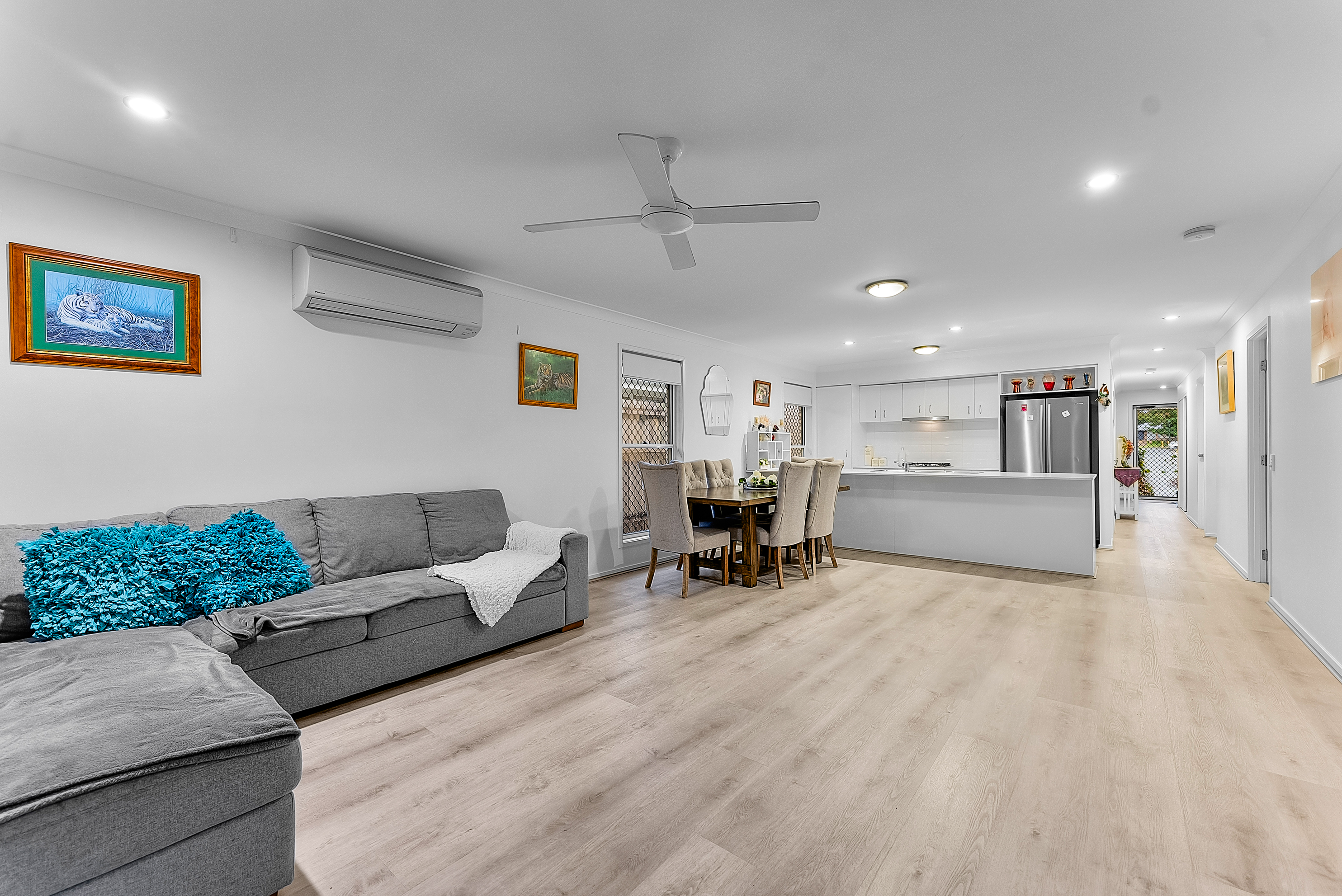 The open-plan design integrates a modern kitchen with updated appliances, overlooking both the dining area and living space. This versatile area boasts a split system AC and fan, ideal for gatherings or quiet evenings at home.