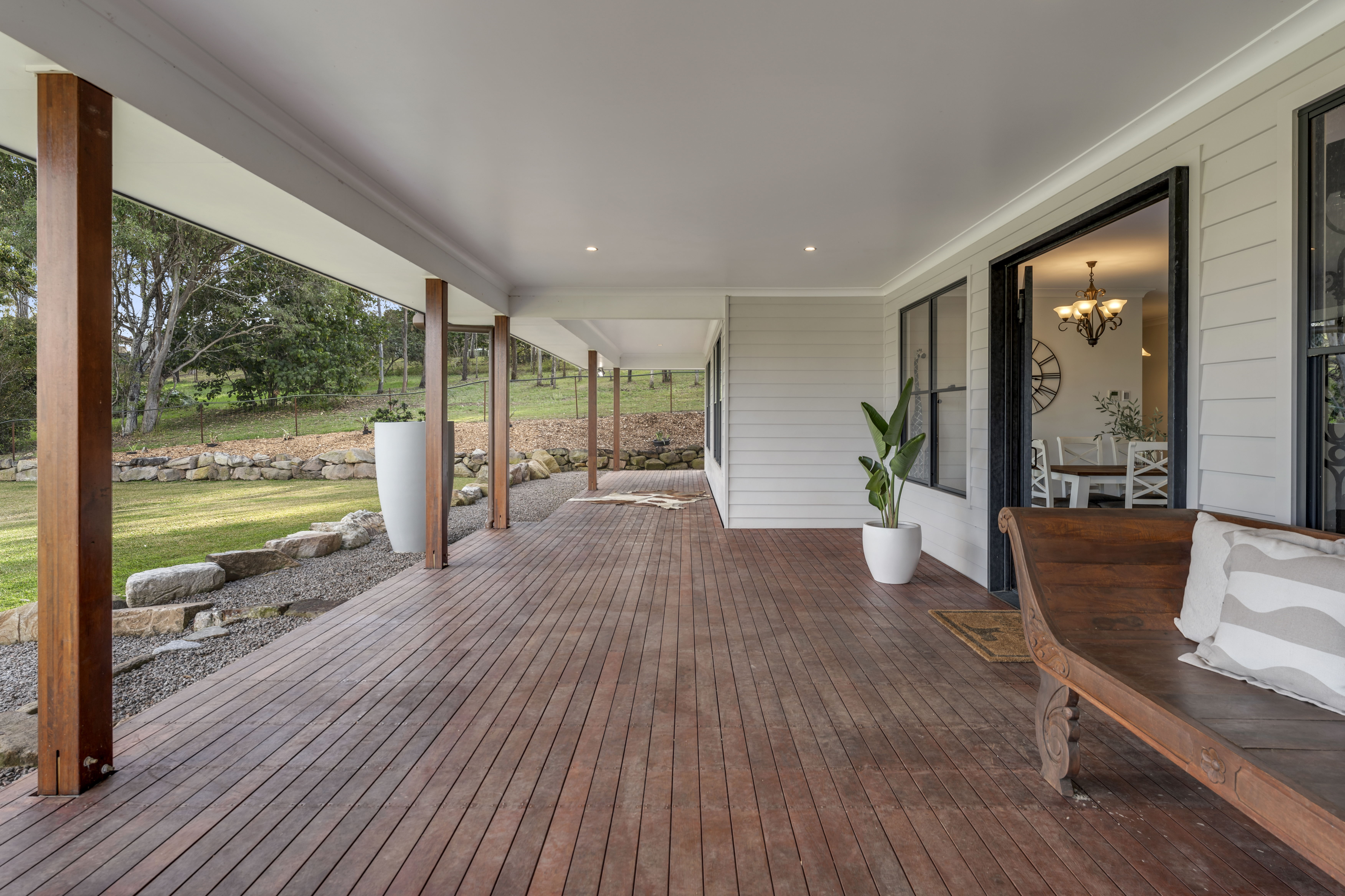 Property Highlights: • Sprawling 1.43-hectare estate in a tranquil country setting • Main residence with five spacious bedrooms, including an indulgent master wing with a walk-in robe and luxurious ensuite • Two bedrooms feature luxe walk-in robes, the remaining have spacious cupboards • Grand entrance through wrought iron double doors • Bamboo timber flooring throughout, adding warmth and elegance • Soaring 9-foot ceilings enhancing the sense of space and grandeur • Seamless flow from the porch to the indoor living spaces and expansive alfresco area • Private media room or dedicated cinema room for immersive entertainment • Two well-appointed bathrooms and two separate toilets for added convenience • Chef-calibre kitchen with granite benchtops, premium appliances and walk-in pantry for additional storage and functionality • Living area with a fireplace, ideal for cosy evenings • Expansive 78m2 front deck overlooking the property, perfect for outdoor living • 75m2 covered rear patio • Self-contained home office with its own carport, kitchenette, bathroom and covered porch • Impeccably landscaped grounds creating a serene environment • Free-standing solar system with 18 panels for energy efficiency • Plantation shutters on most bedrooms and bathrooms for privacy and style • Full ducted air conditioning and seven ceiling fans for year-round comfort • Gutter guard protection on the house and sheds for low-maintenance living • Brand new 2-car garage with integrated laundry • Two 30,000 L water tanks and a well-maintained BioCycle system, serviced quarterly • Fully fenced property for enhanced security and privacy • Horse stables, work shed, dog enclosure and chook pen • Unlimited free water from windmill • 45,000 ltr holding tanks