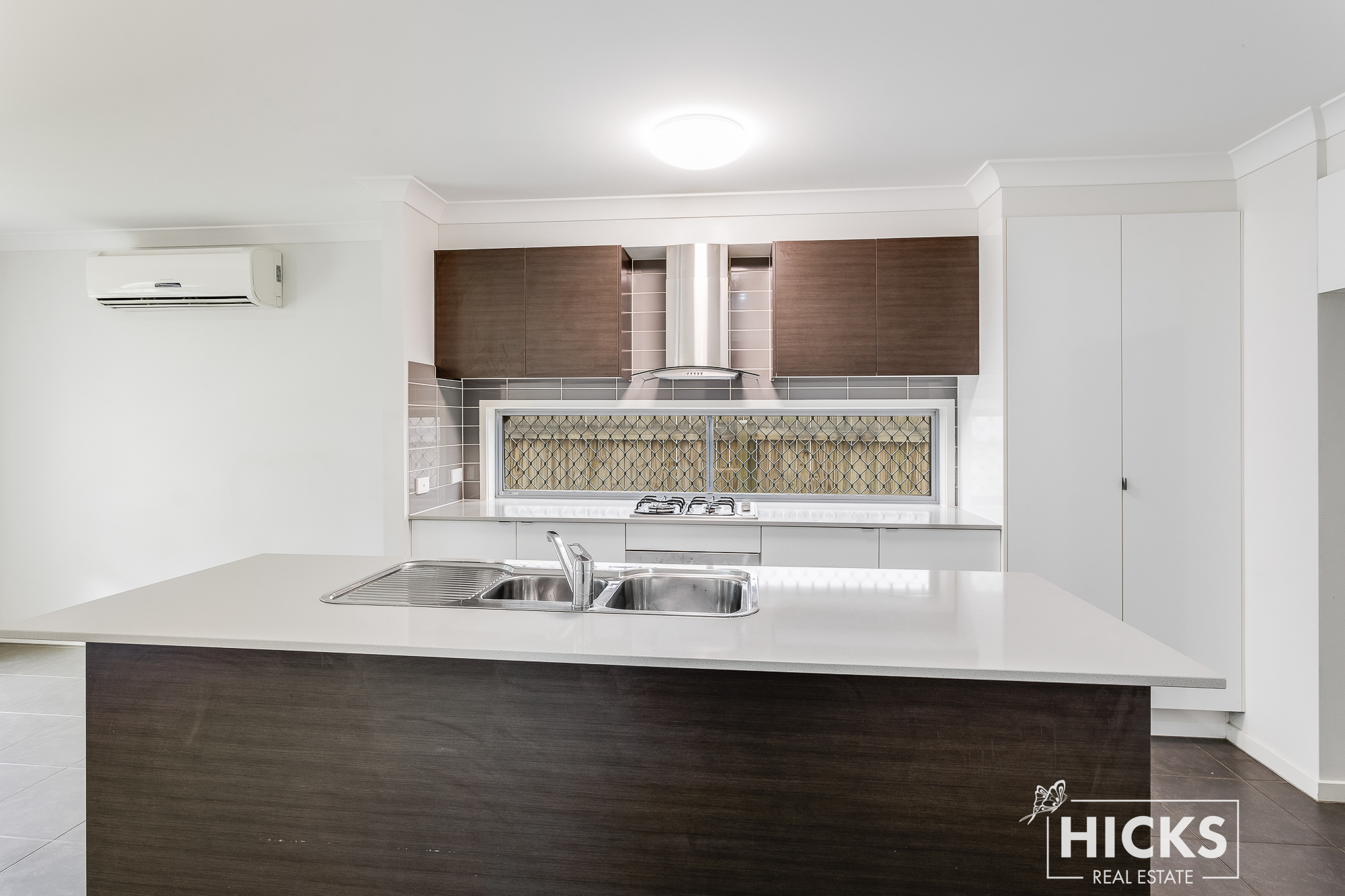 The modern kitchen features stainless steel appliances, and the open-plan dining and family room flows effortlessly to the covered outdoor area, ideal for entertaining. Downstairs is also air-conditioned, ensuring comfort year-round.