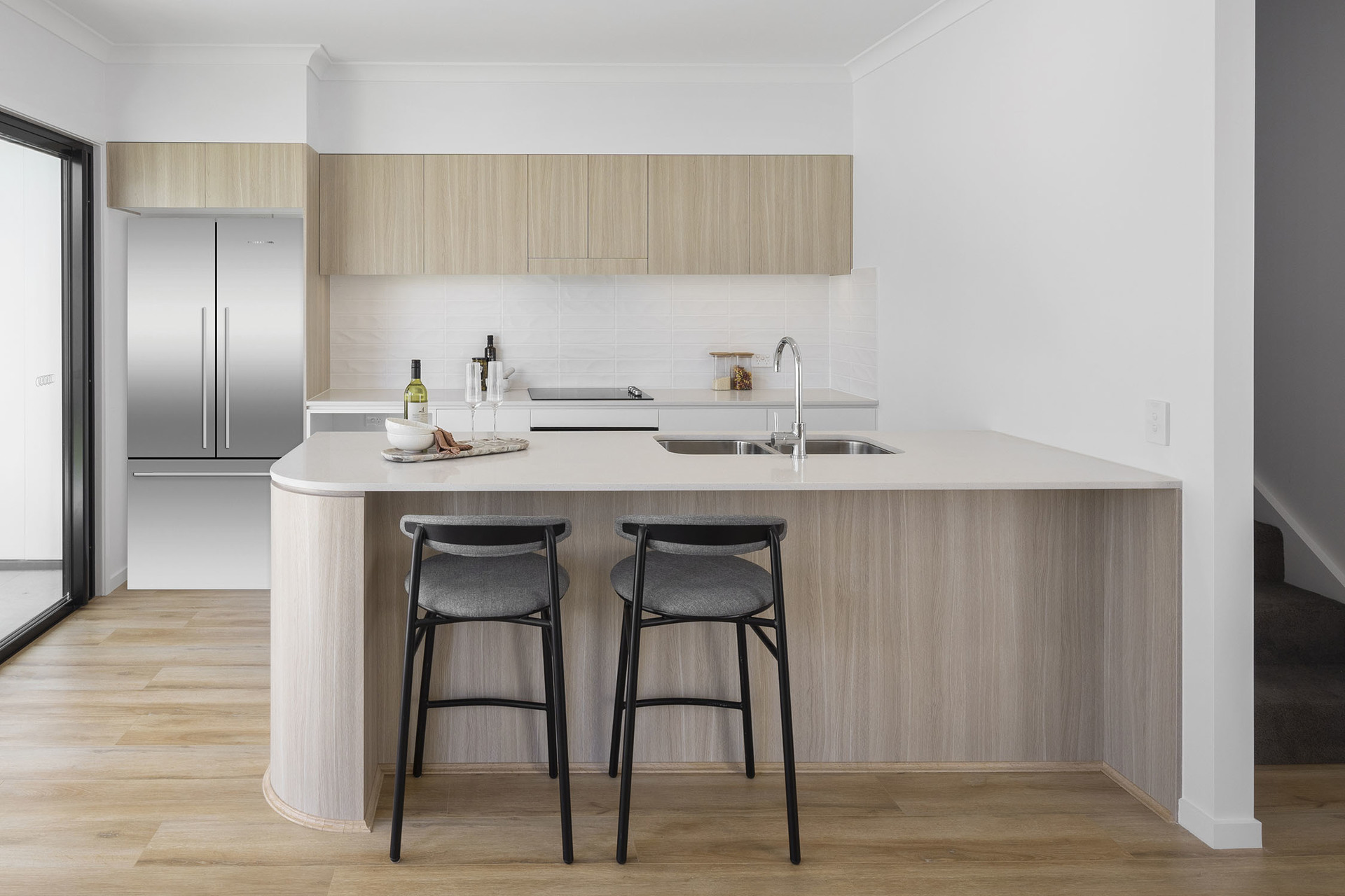 Curved island bench, modern kitchen with contemporary cupboards and electric appliances -